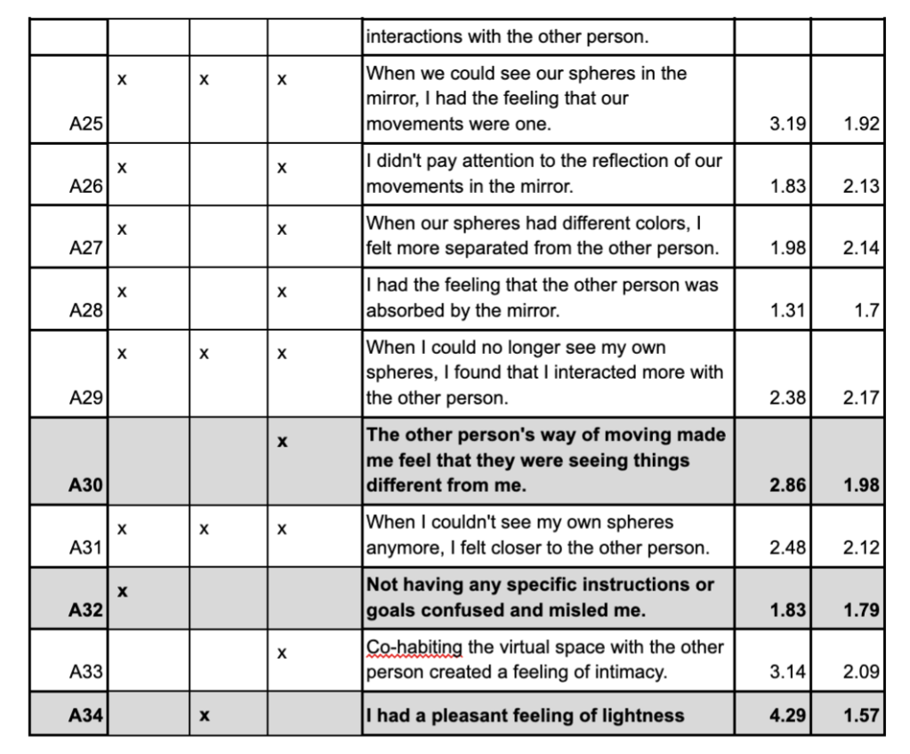 Figure 2: Categories and quantitative results of post-experiential questionnaires. NB, the assertion numbers start at 9 since the first 8 items contained demographic information. Highlighted rows correspond to questions for which agreement was high. 0- totally disagree, 6 – strongly agree