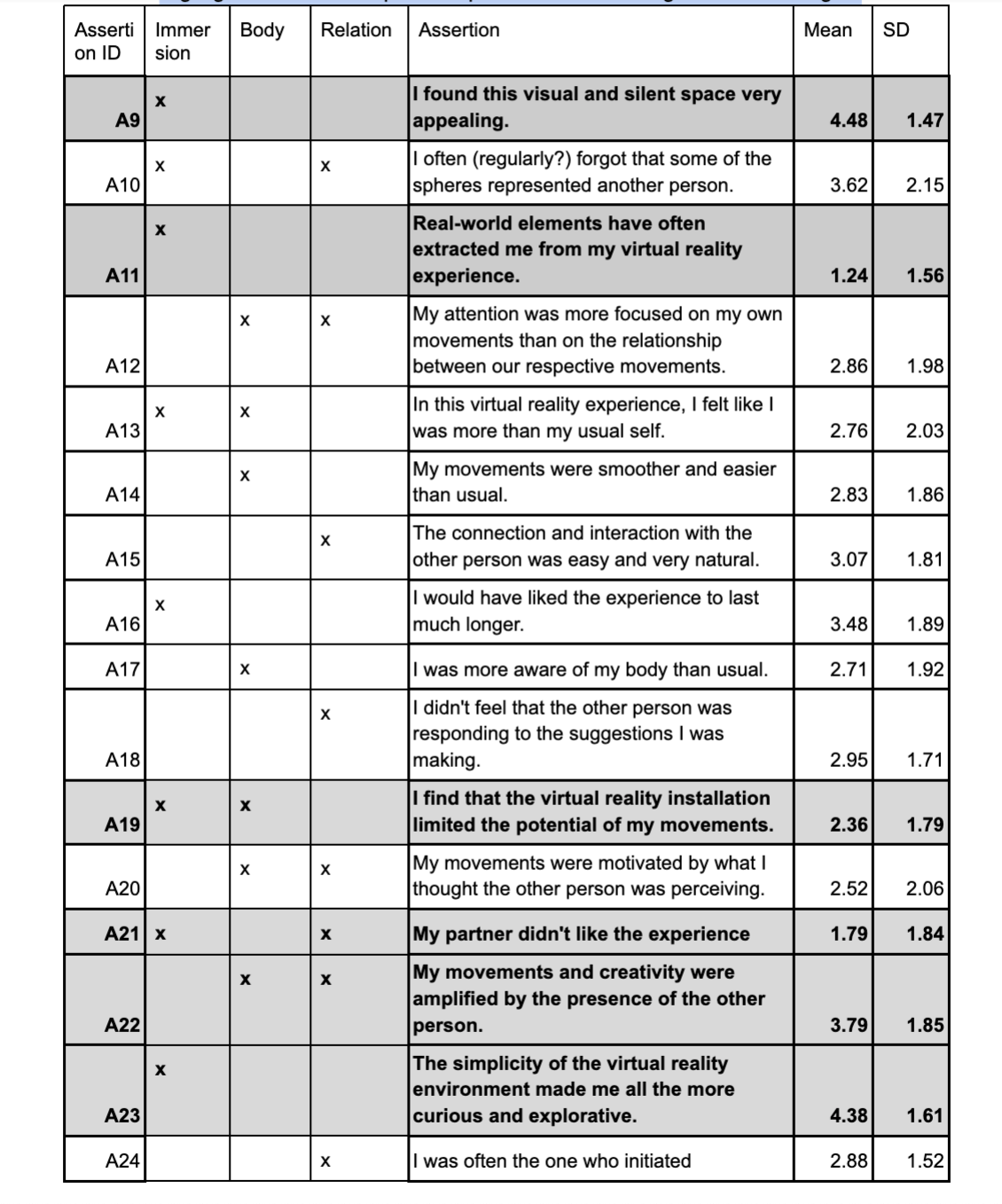 Figure 2: Categories and quantitative results of post-experiential questionnaires. NB, the assertion numbers start at 9 since the first 8 items contained demographic information. Highlighted rows correspond to questions for which agreement was high. 0- totally disagree, 6 – strongly agree